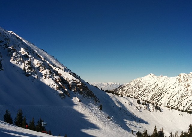 Alta is my favorite place to ski. [No snowboarders.] Rock 'n Roll. Challenger. Rollercoaster. Corkscrew. Staring down the steep and narrow Extrovert, my bravado faded fast. [Repeat after me: You're a better skier than you think you are.] Definitely outside my comfort zone, and that's important.